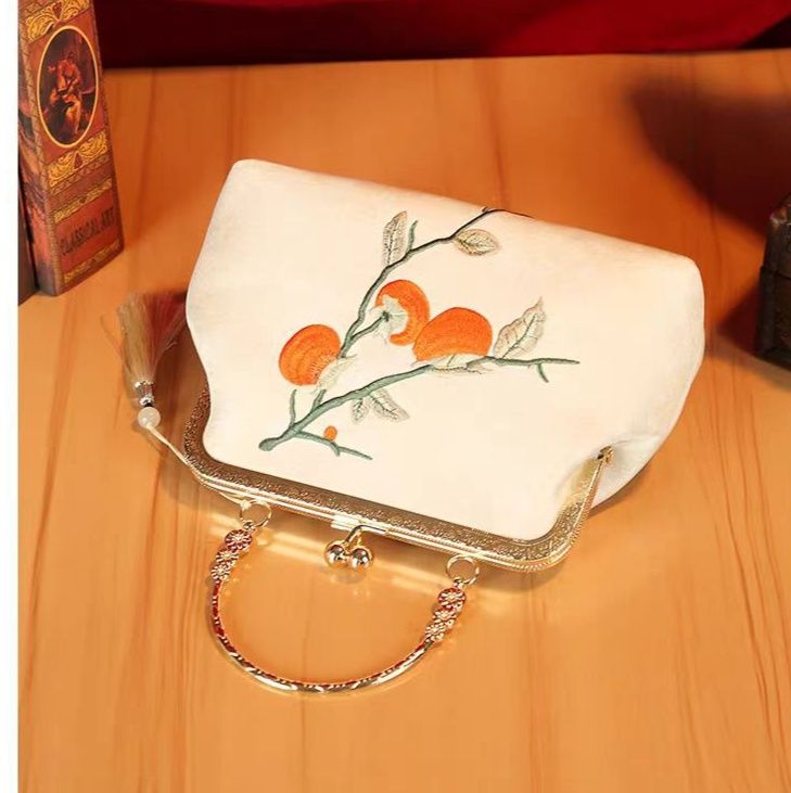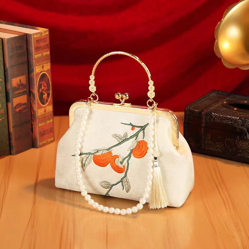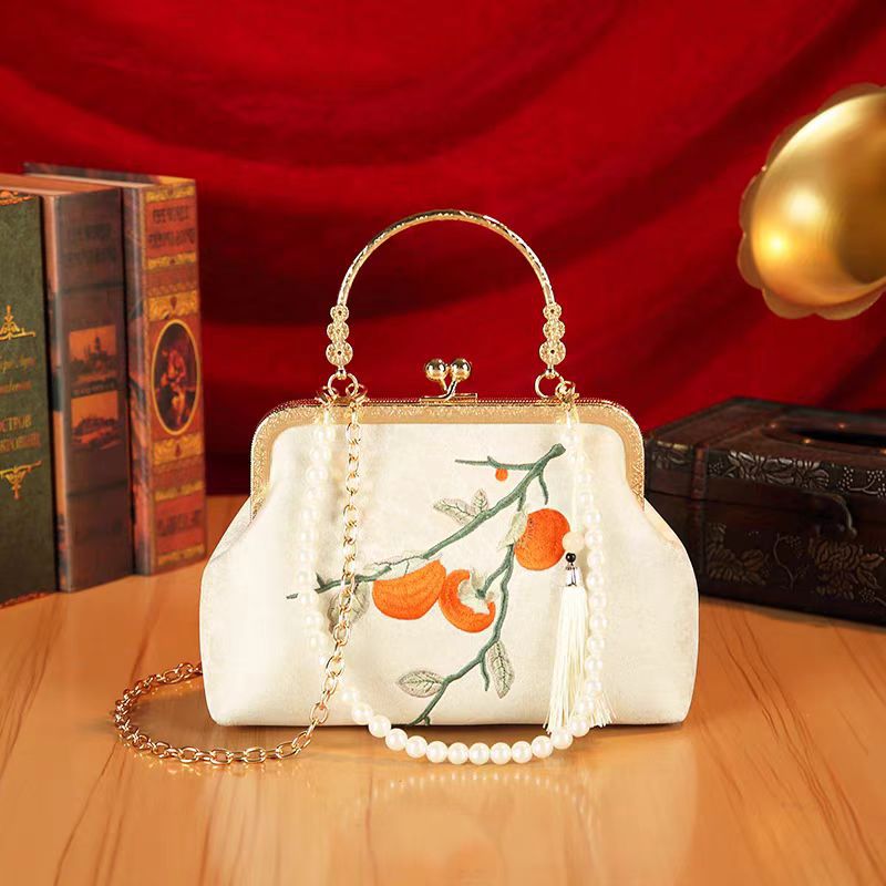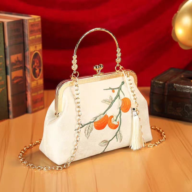 秋の風情を感じる柿の実の刺繍が美しい着物バッグです。 がま口タイプの開閉で使いやすく、取り外し可能なチェーンストラップ付きで手提げとしてもショルダーバッグとしてもお使いいただけます。 華やかな金具と流れるような房飾りが和の装いに上品な華やぎを添えます。 結婚式やお茶会などのフォーマルシーンから普段のお出かけまで幅広くご活用いただけます。