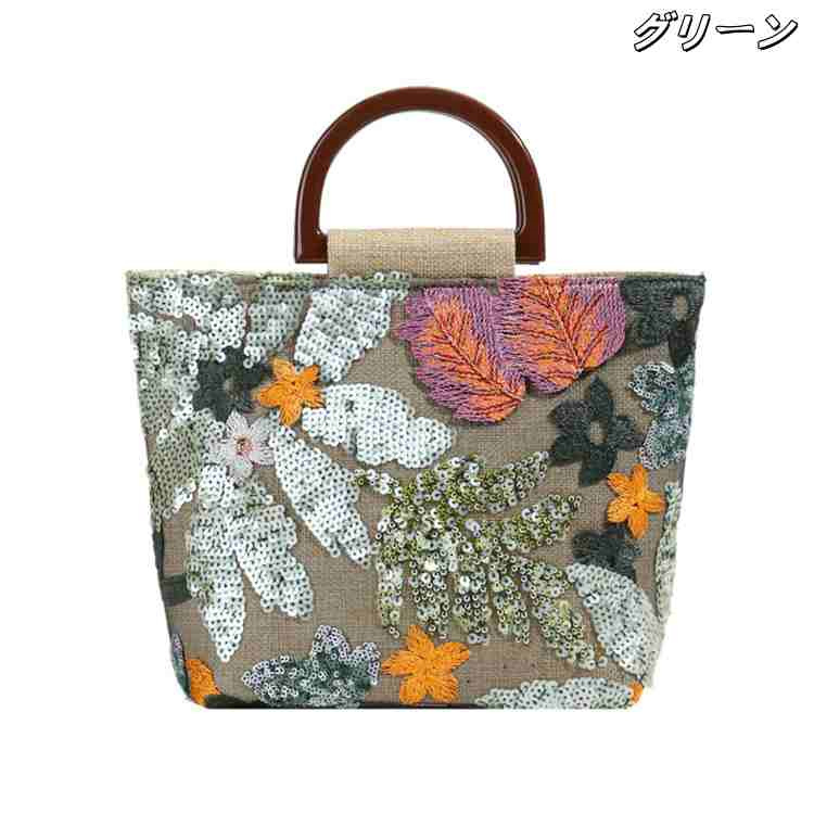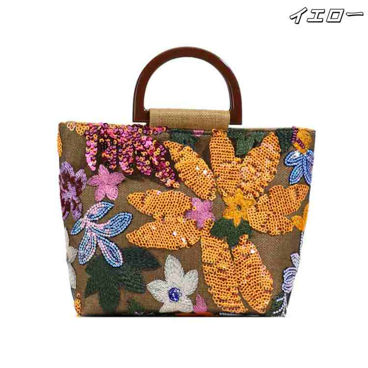 花柄の刺繍とスパンコール装飾が和の趣を演出し、竹節風の持ち手がアクセントになっています。
