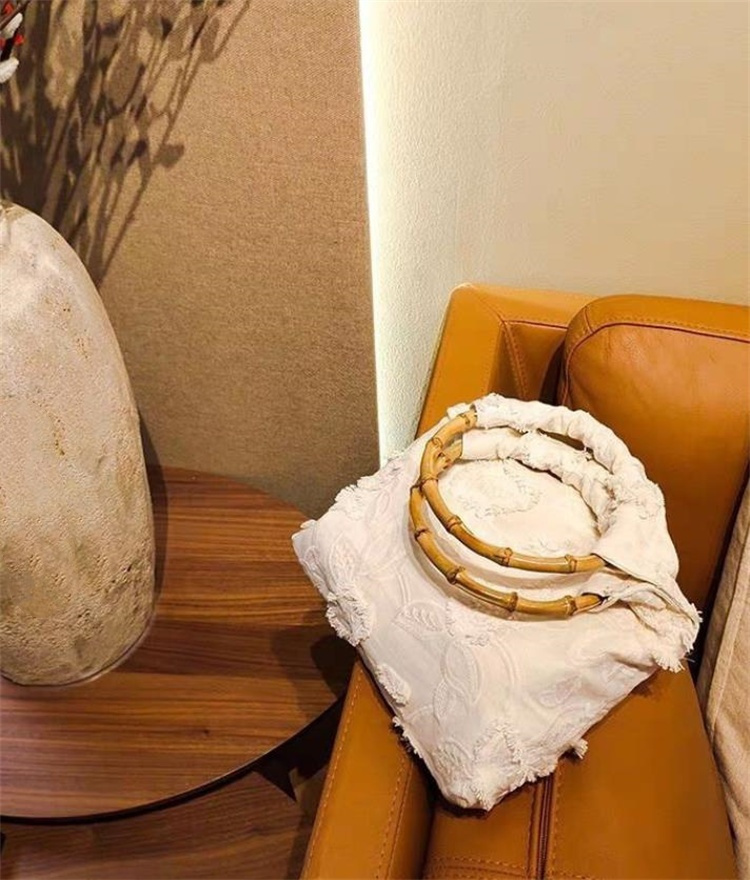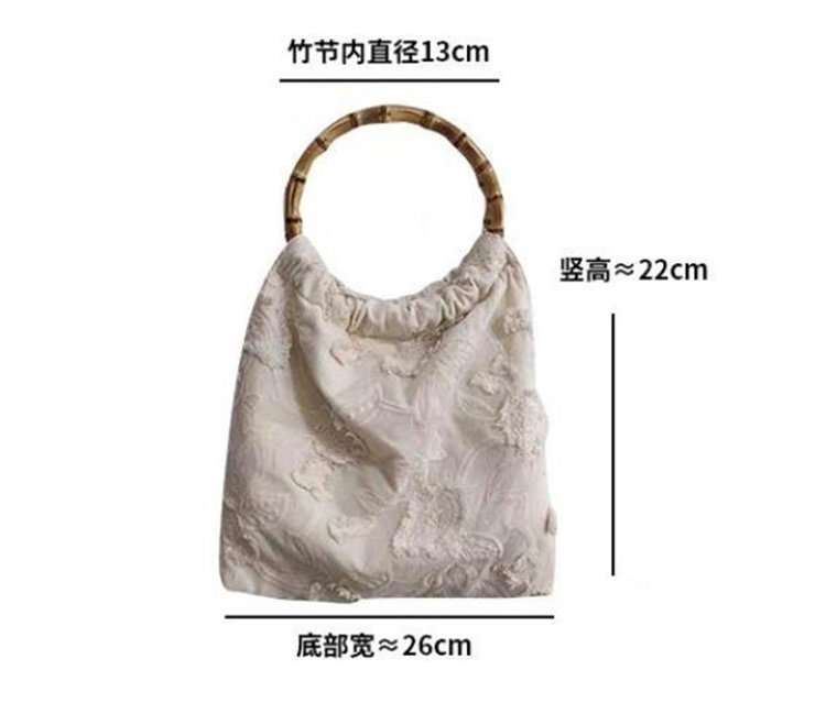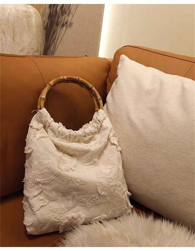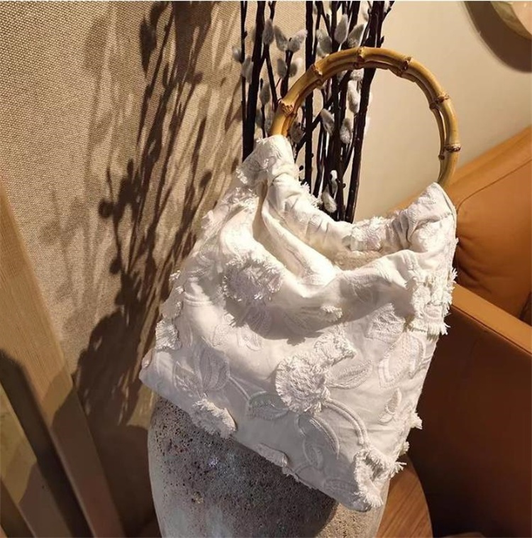 白い帆布地に繊細な手刺繍で花柄を施し、竹の持ち手が上品な和風デザインを演出。