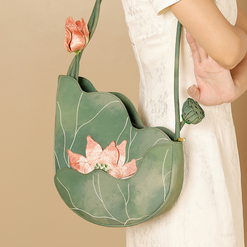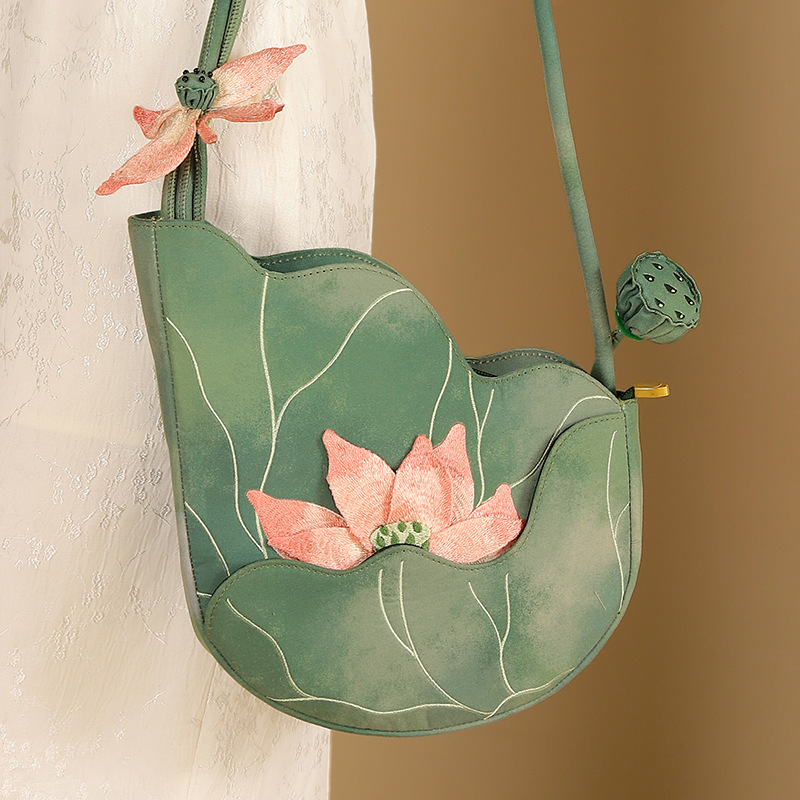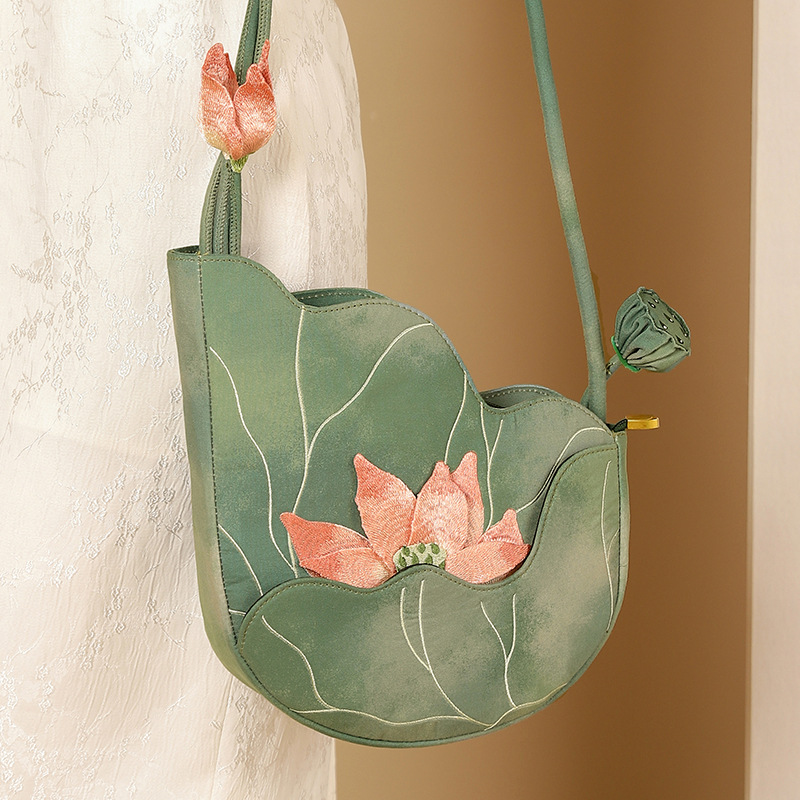 【新作】中国風ハス刺繍ショルダーバッグ|手作り刺繍で和服にも映えるエレガントデザイン