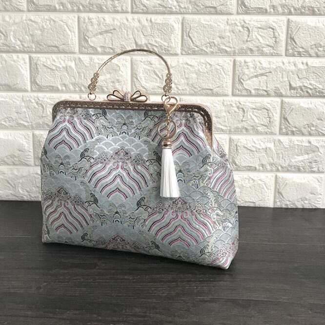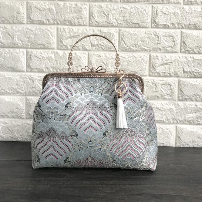 伝統的な波模様の織り生地を使用した着物バッグです。 がま口式の開閉部分には装飾的な金具とリボンモチーフがあしらわれており、上品な雰囲気を演出します。 取り外し可能なタッセル飾りが華やかさを添え、普段使いから特別な日まで幅広くお使いいただけます。 和装にも洋装にも合わせやすい、伝統と現代が融合した逸品です。