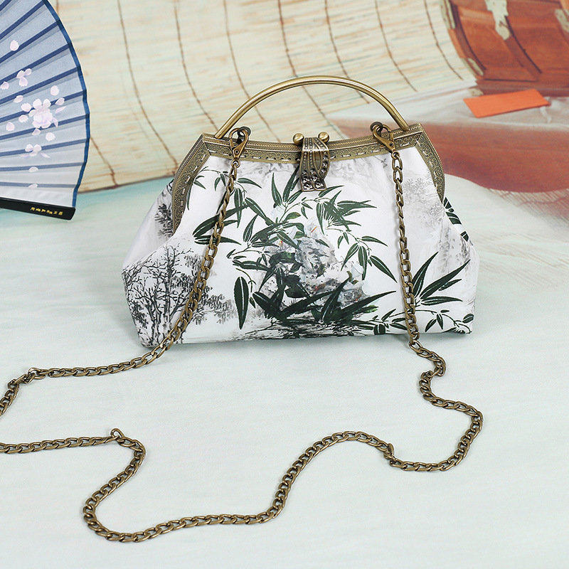 和の風情を感じる水墨画調の竹柄が美しい着物バッグです。 がま口式の開閉で使い勝手がよく、上品な金具が和装にも洋装にも調和します。 ショルダーバッグとして持ち歩けば、日常のお出かけから特別な日まで幅広く活躍します。 趣のある絵柄が大人の品格を演出し、小物入れとしても最適なサイズ感が魅力的な逸品です。