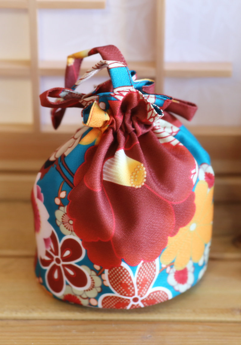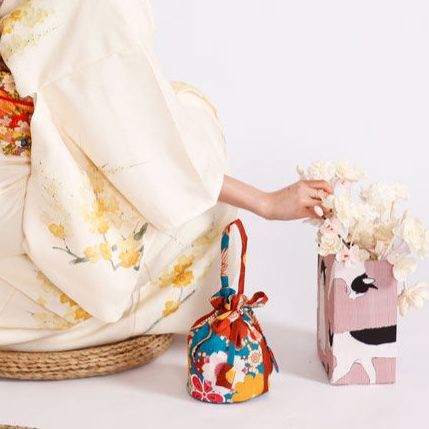 伝統的な梅の花模様をあしらった巾着型の着物バッグです。