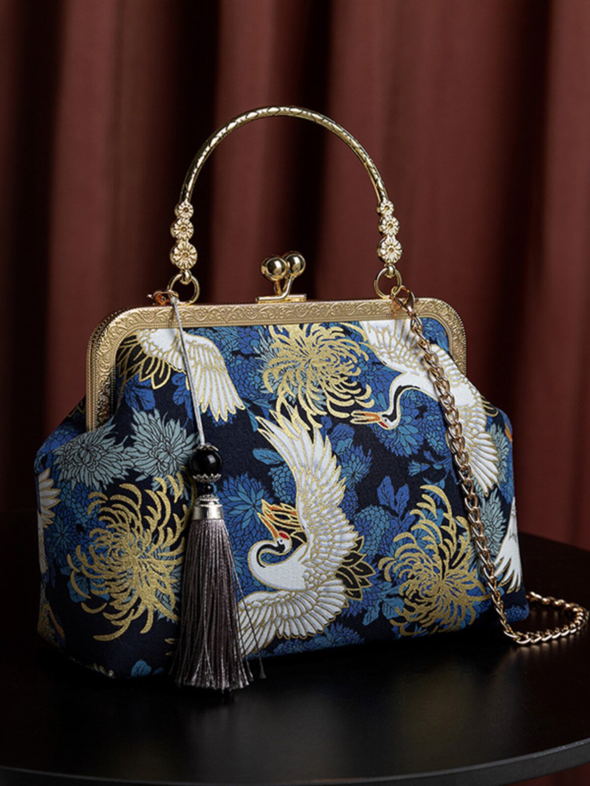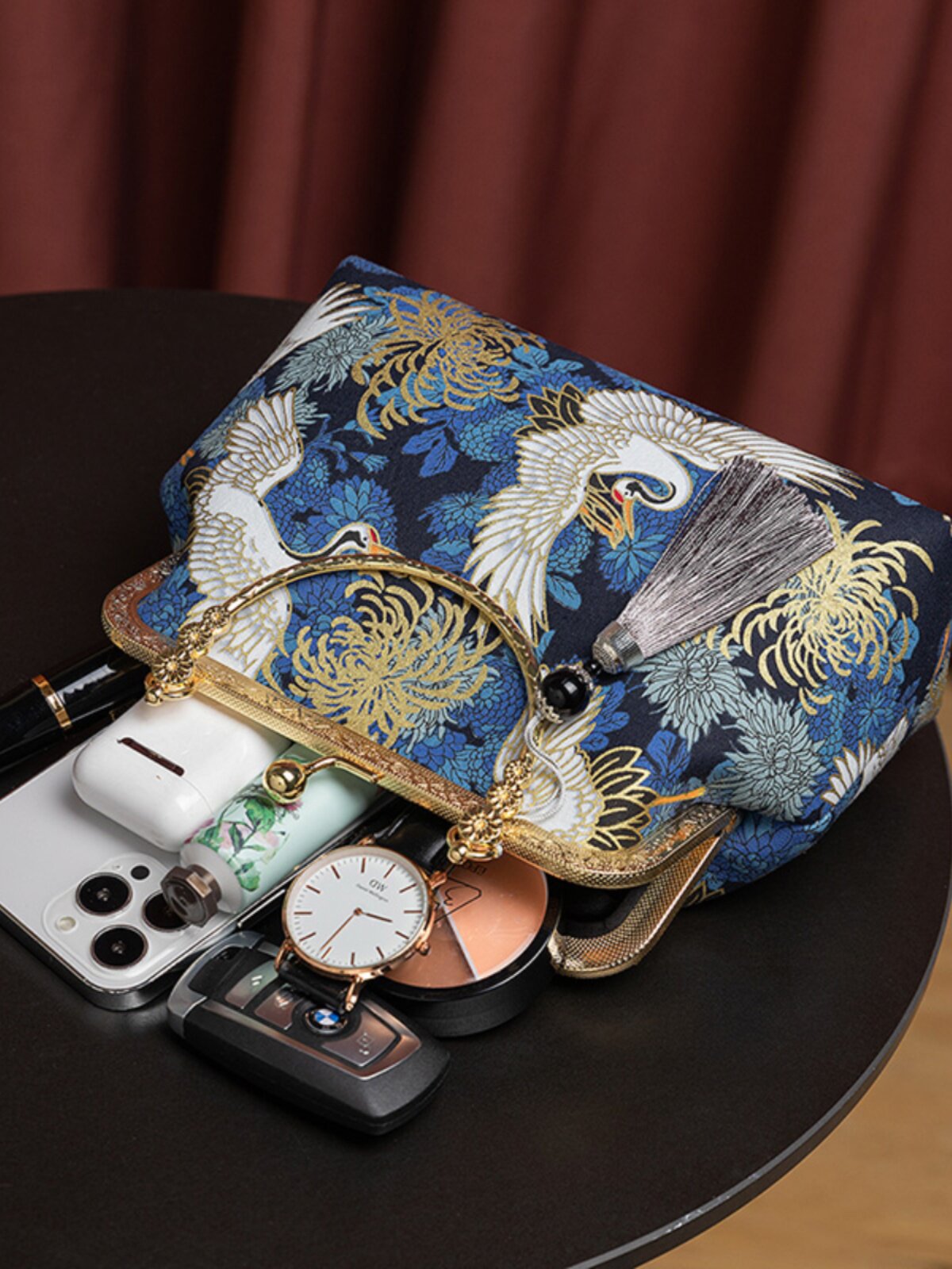 優雅に舞う鶴と華やかな菊の刺繍が美しい着物バッグです。 伝統的ながま口式の開閉部分と取り外し可能なチェーンストラップ付きで、クラッチバッグとしても肩掛けとしても使える便利な二通りの持ち方ができます。 結婚式や成人式などの晴れの日から、お茶会や観劇まで幅広い和装シーンに対応します。 タッセル飾りが上品なアクセントとなり、格調高い装いを演出します。