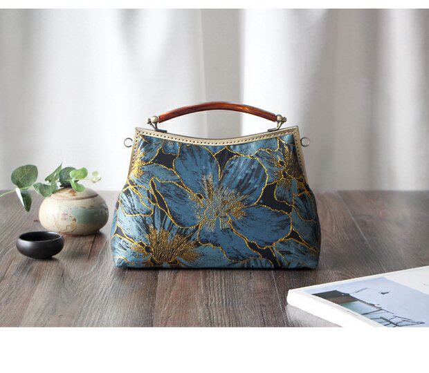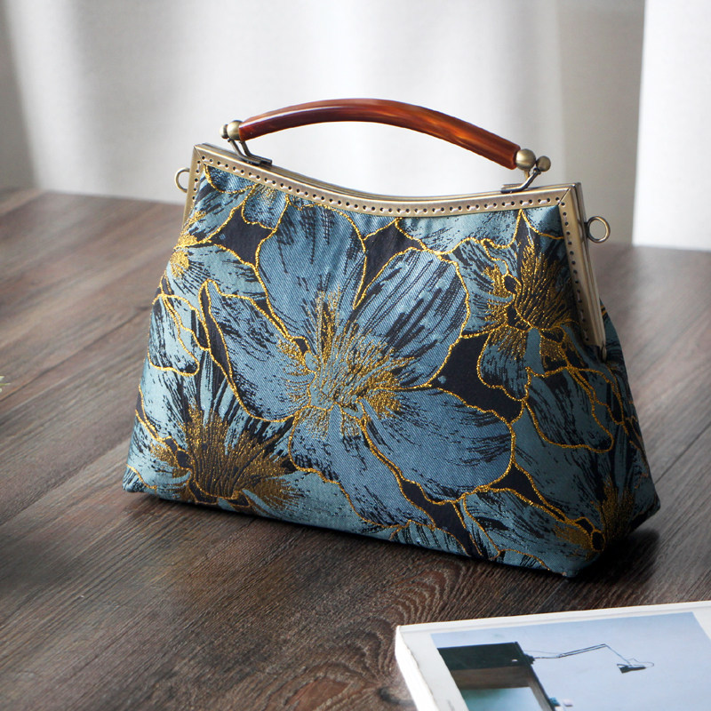 華やかな大輪の花模様を金糸で刺繍した、上品な着物バッグです。 格調高いがま口タイプのクラッチバッグで、結婚式やパーティーなどの特別な日にぴったりです。 木製の持ち手が和の雰囲気を引き立て、金具の装飾が高級感を演出します。 着物や訪問着との相性が抜群で、和装の装いを華やかに彩ります。 コンパクトながら必需品をしっかり収納でき、大人の女性にふさわしい逸品です。